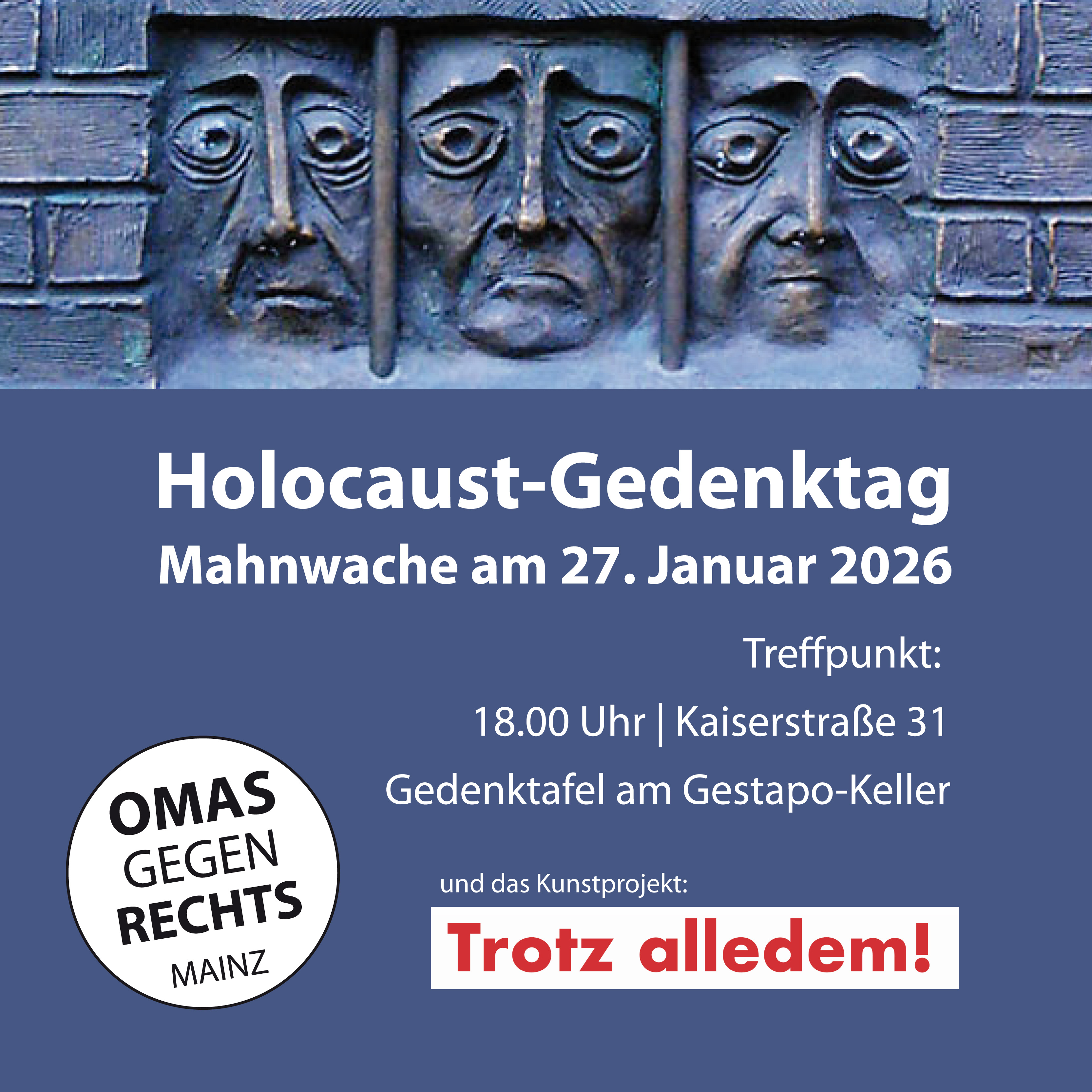 Anlässlich des Holocaust-Gedenktages veranstalten wir - in diesem Jahr gemeinsam mit dem Kunstprojekt Trotz alledem! - eine Mahnwache an dem ehemaligen Gestapo-Keller in der Kaiserstraße 31. Wer mag, kann gerne ein Grablicht mitbringen.